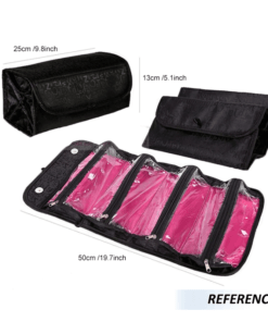Bolso enrollable de maquillaje suficiente tamaño para adaptarse a los cepillos de maquillaje y pelo, posee 4 compartimento para separar su maquillaje, productos de aseo entre otros. Además tiene un gancho para colgarlo en tu armario o en el baño.